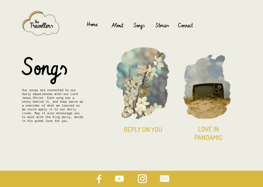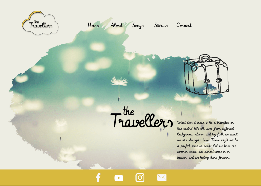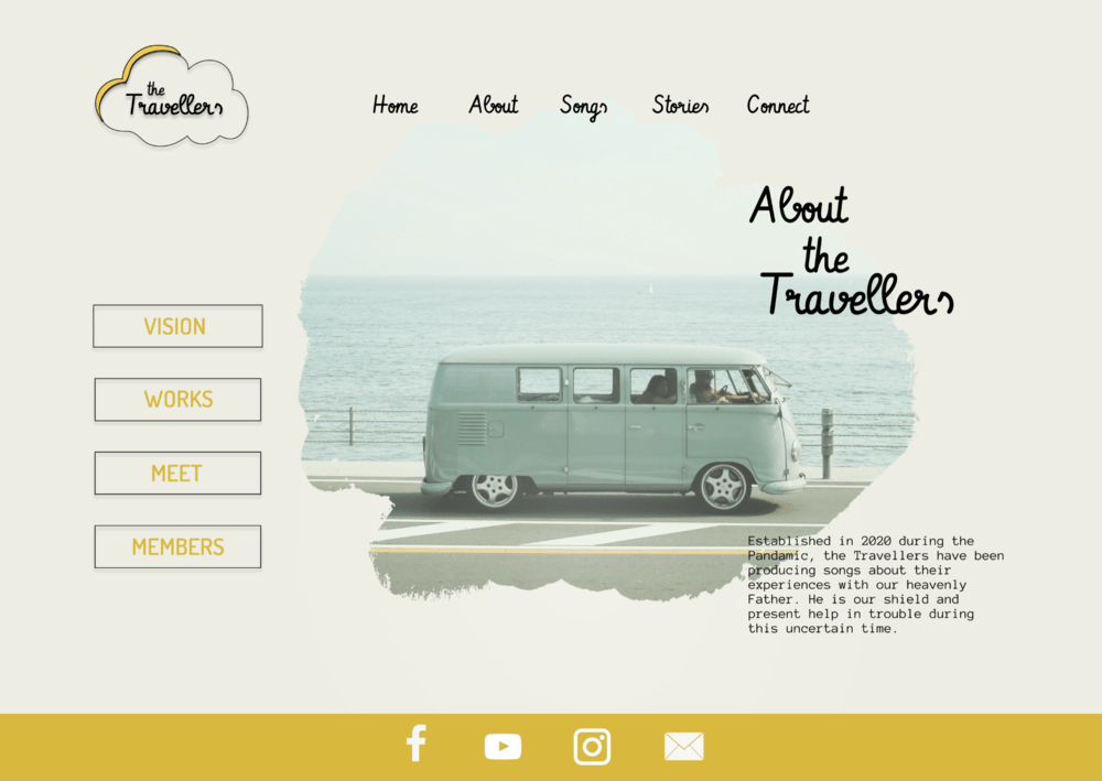 I designed a website for The Travellers, a local band formed by a group of Chinese immigrants who use music to connect with the community and promote healing and belonging. The website reflects their story and mission through a warm, inviting design that highlights their performances, music, and cultural roots.