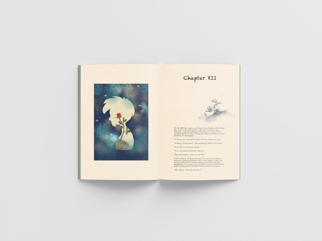 This project is a complete rebranding of The Little Prince by Antoine de Saint-Exupéry. I developed a refreshed visual identity that reimagines the story and its characters through a contemporary lens. The work includes a redesigned book cover, interior layout, and a series of original character illustrations, which were applied to realistic book prototypes to showcase the final concept.